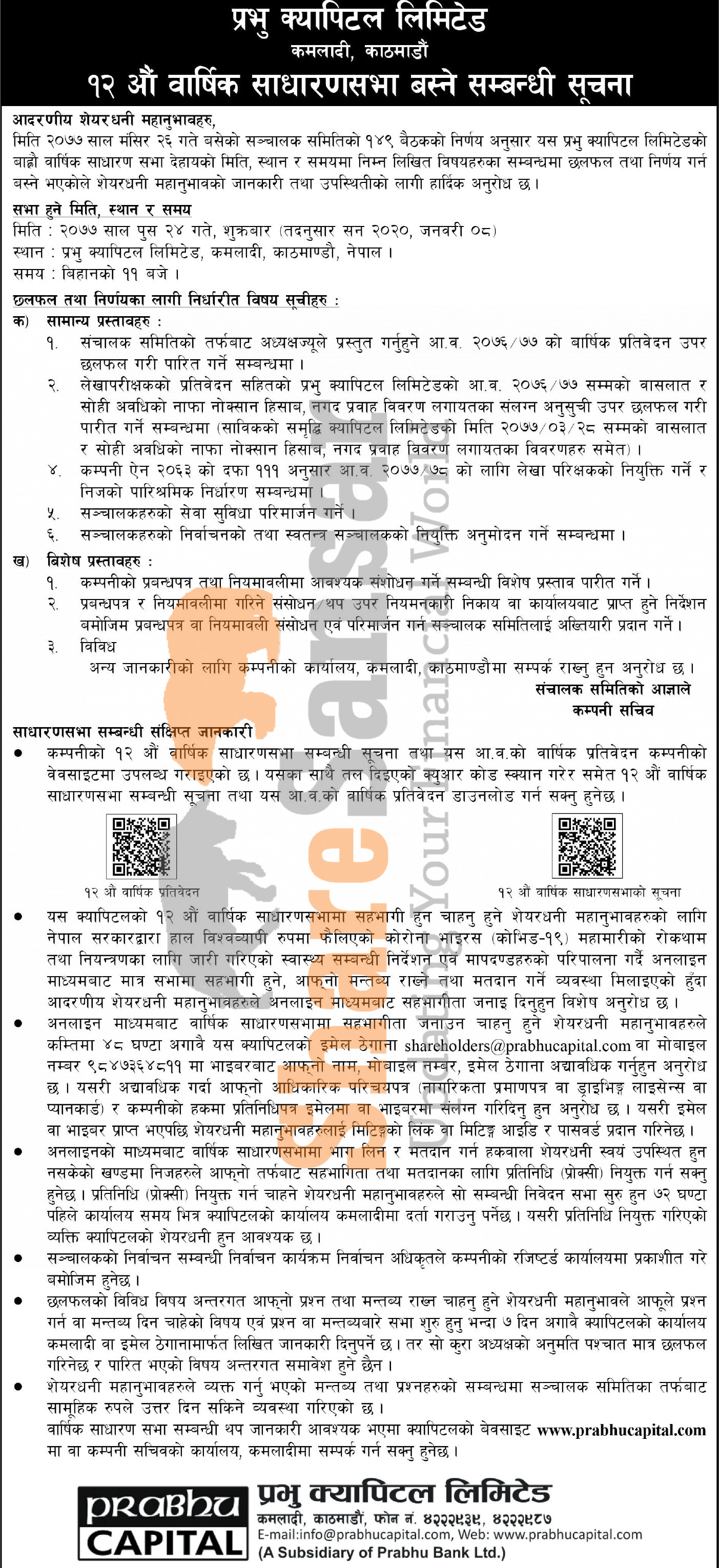 Prabhu Capital Limited has announced its 12th AGM going to be held on 24th Poush, 2077.