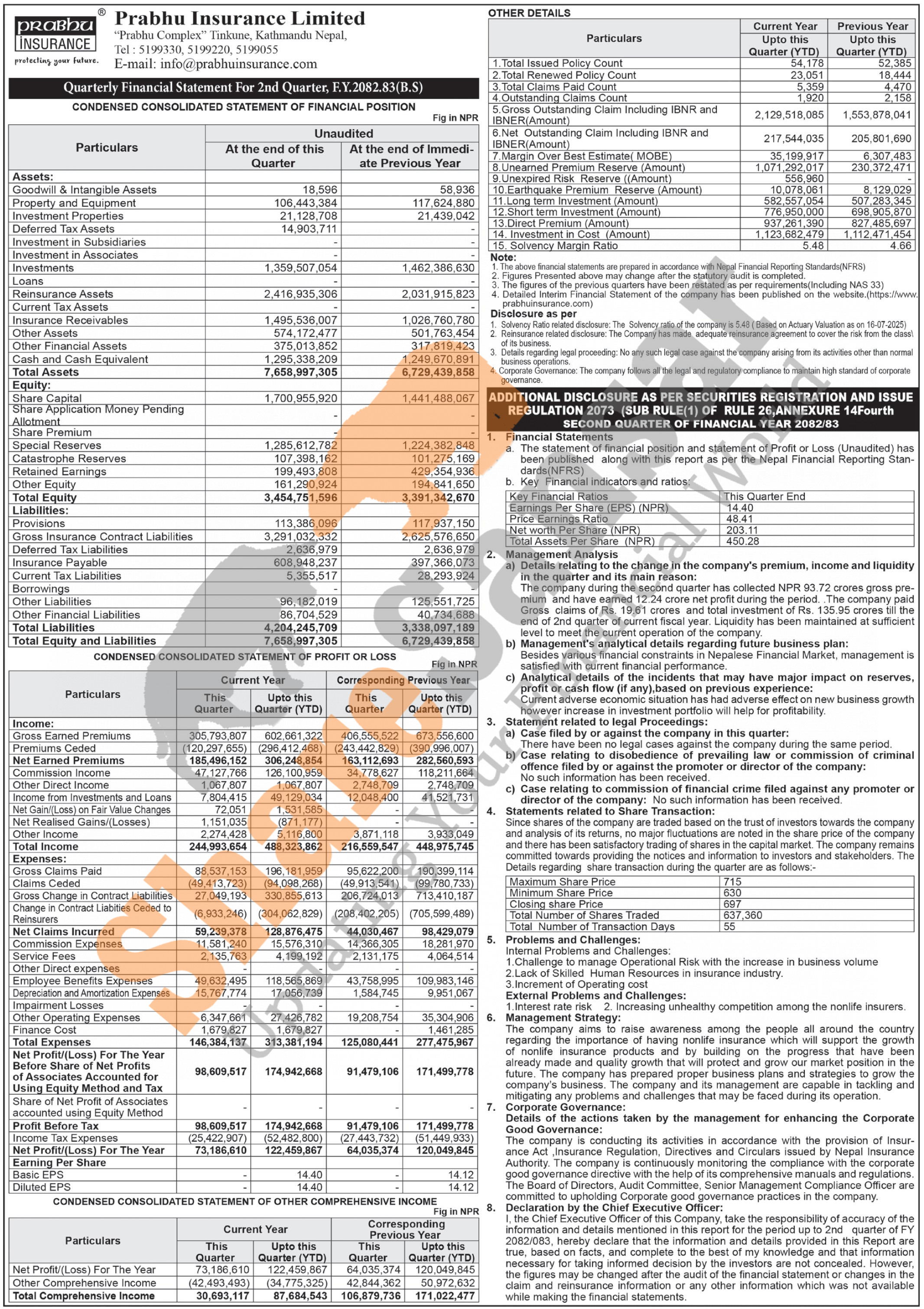 Prabhu Insurance Company Limited has posted a net profit of Rs 122.45 million and published its 2nd quarter company analysis of the fiscal year 2082/83.