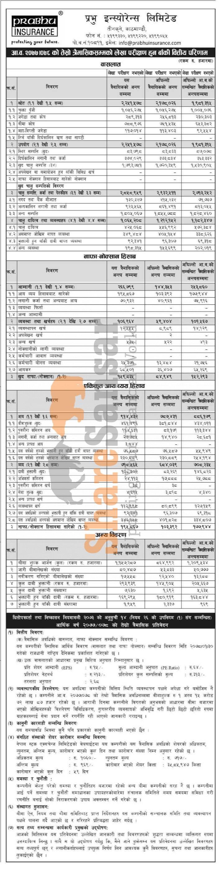 Prabhu Insurance Company Limited has posted a net profit of Rs 159.83 million and published its 3rd quarter company analysis of the fiscal year 2077/78.
