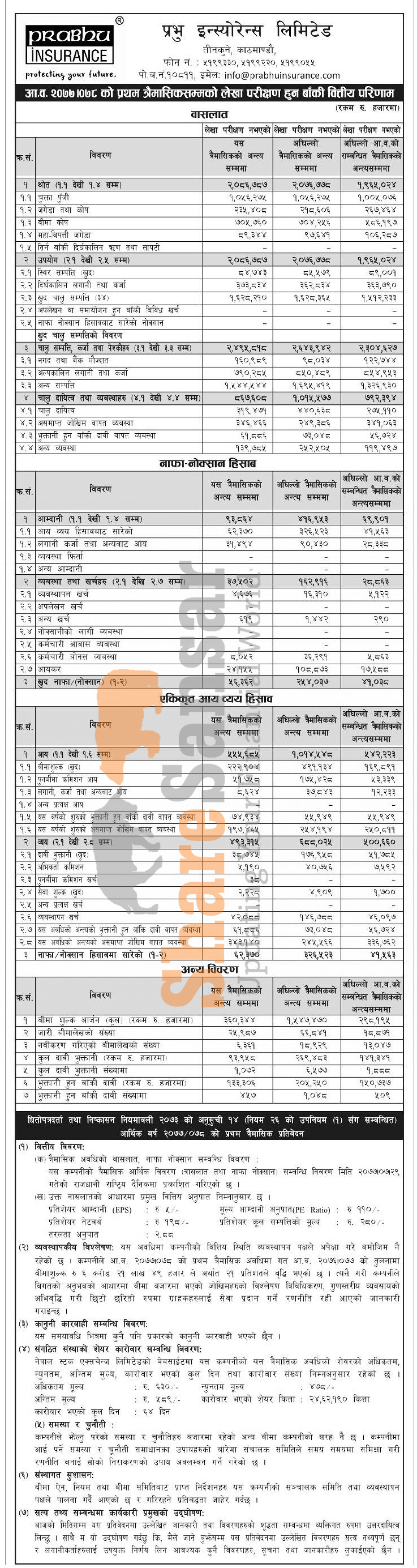 Prabhu Insurance Company Limited has posted a net profit of Rs 56.36 million and published its 1st quarter company analysis of the fiscal year 2077/78.