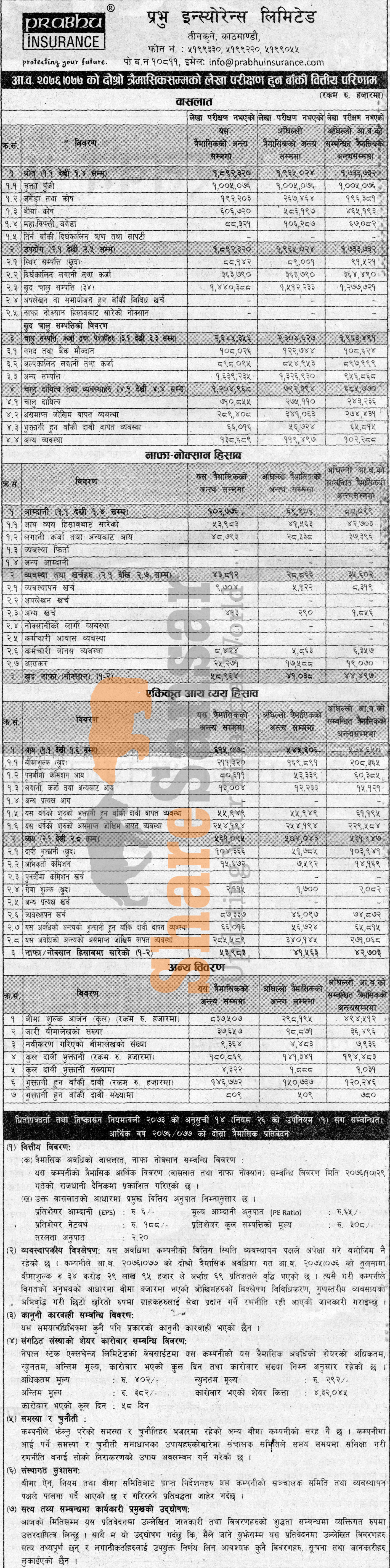 Prabhu Insurance Company Limited has posted a net profit of Rs 58.96 million and published its 2nd quarter company analysis of the fiscal year 2076/77.