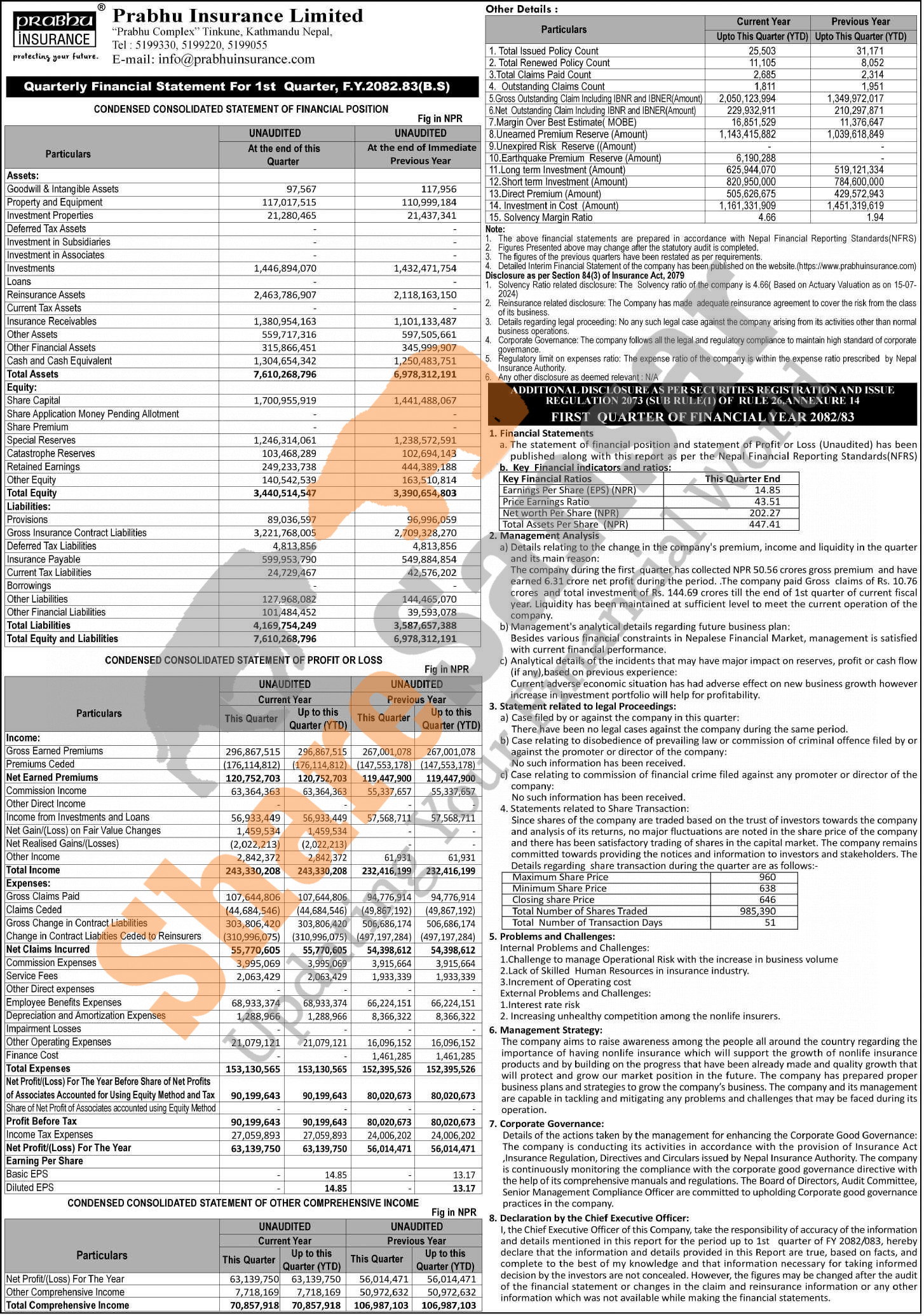 Prabhu Insurance Company Limited has posted a net profit of Rs 63.13 million and published its 1st quarter company analysis of the fiscal year 2082/83.