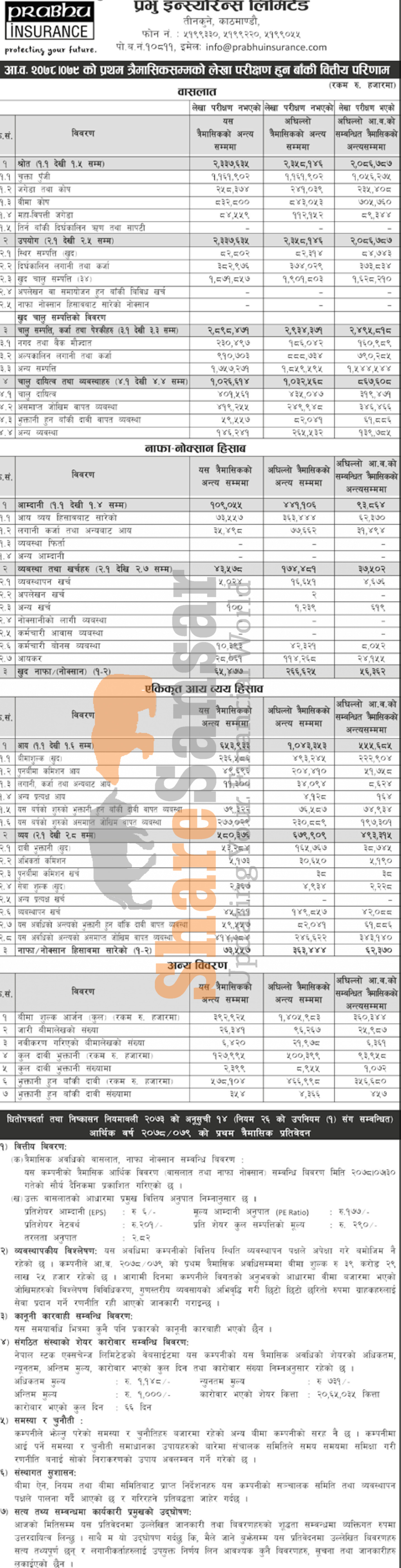 Prabhu Insurance Company Limited has posted a net profit of Rs 65.47 million and published its 1st quarter company analysis of the fiscal year 2078/79.