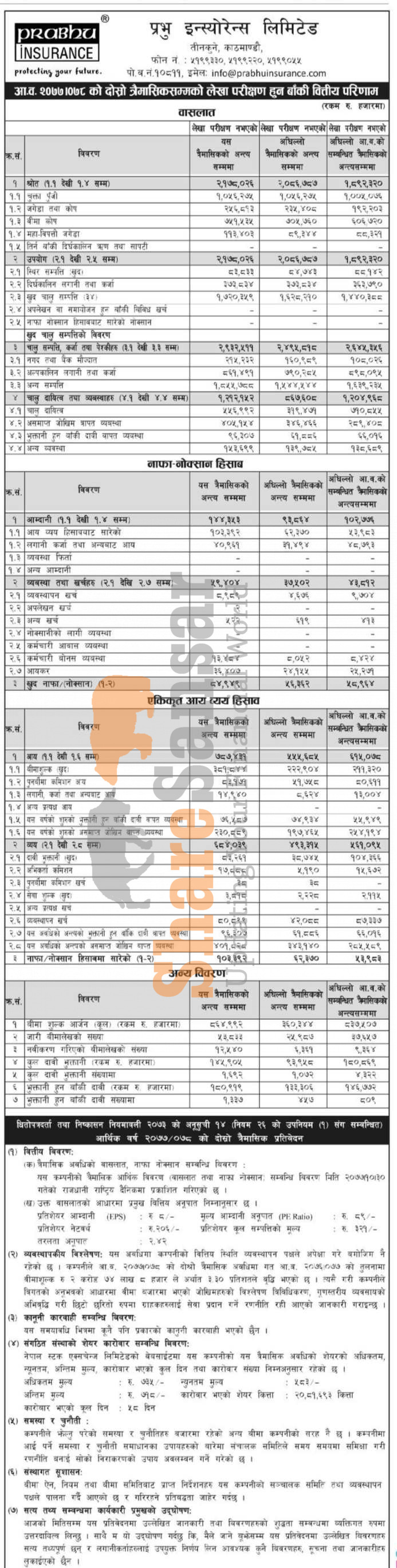 Prabhu Insurance Company Limited has posted a net profit of Rs 84.94 million and published its 2nd quarter company analysis of the fiscal year 2077/78.
