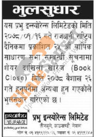 Prabhu Insurance Limited has amended book closure date of its 25th AGM.