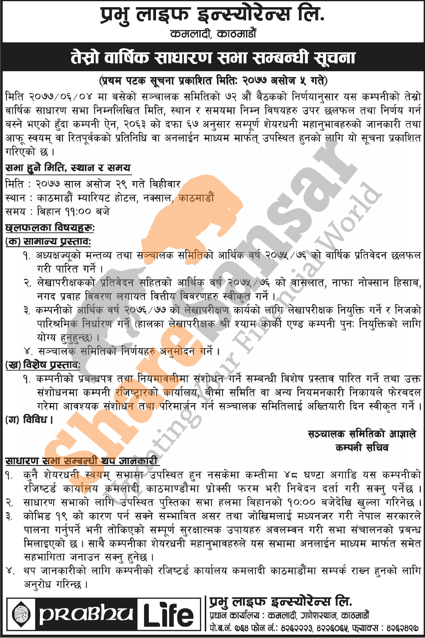 Prabhu Life Insurance Limited has announced its 3rd AGM going to be held on 29th Ashwin, 2077.