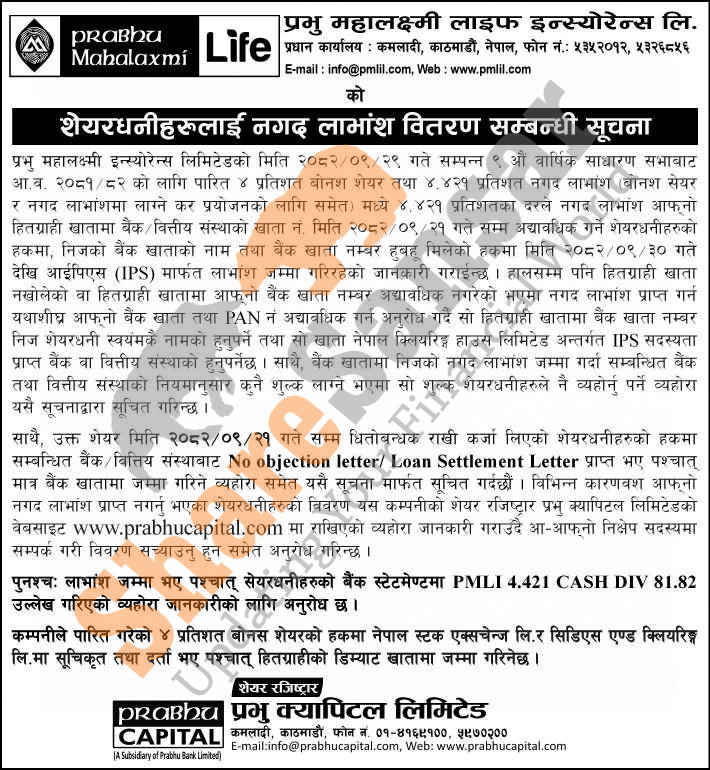 Prabhu Mahalaxmi Life Insurance Company Limited has distributed 4.421% cash dividend directly to the bank account of its shareholders.