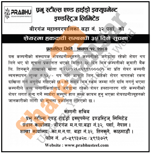 Prabhu Steels & Hydro Equipment Industries Limited has published a notice to its promoter shareholders to deposit additional share payment within the given time frame.