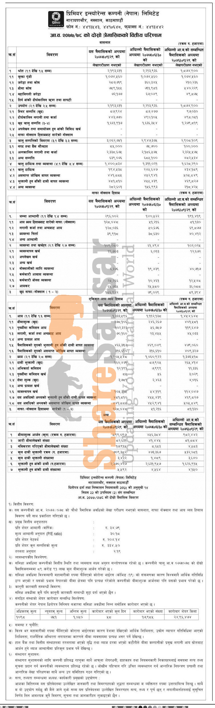 Premier Insurance Company Limited has posted a net profit of Rs 186.92 million and published its 2nd quarter company analysis of the fiscal year 2077/78.