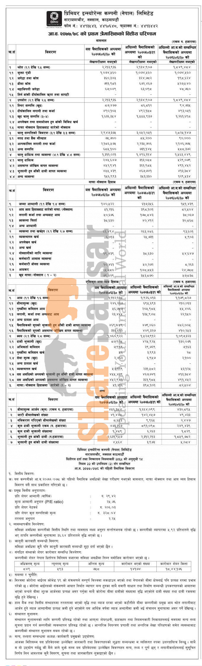 Premier Insurance Company Limited has posted a net profit of Rs 79.02 million and published its 1st quarter company analysis of the fiscal year 2077/78.