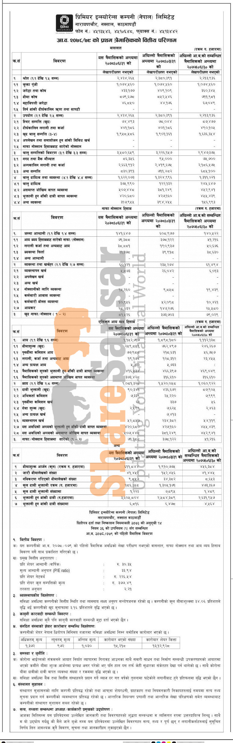Premier Insurance Company Limited has posted a net profit of Rs 81.52 million and published its 1st quarter company analysis of the fiscal year 2078/79.