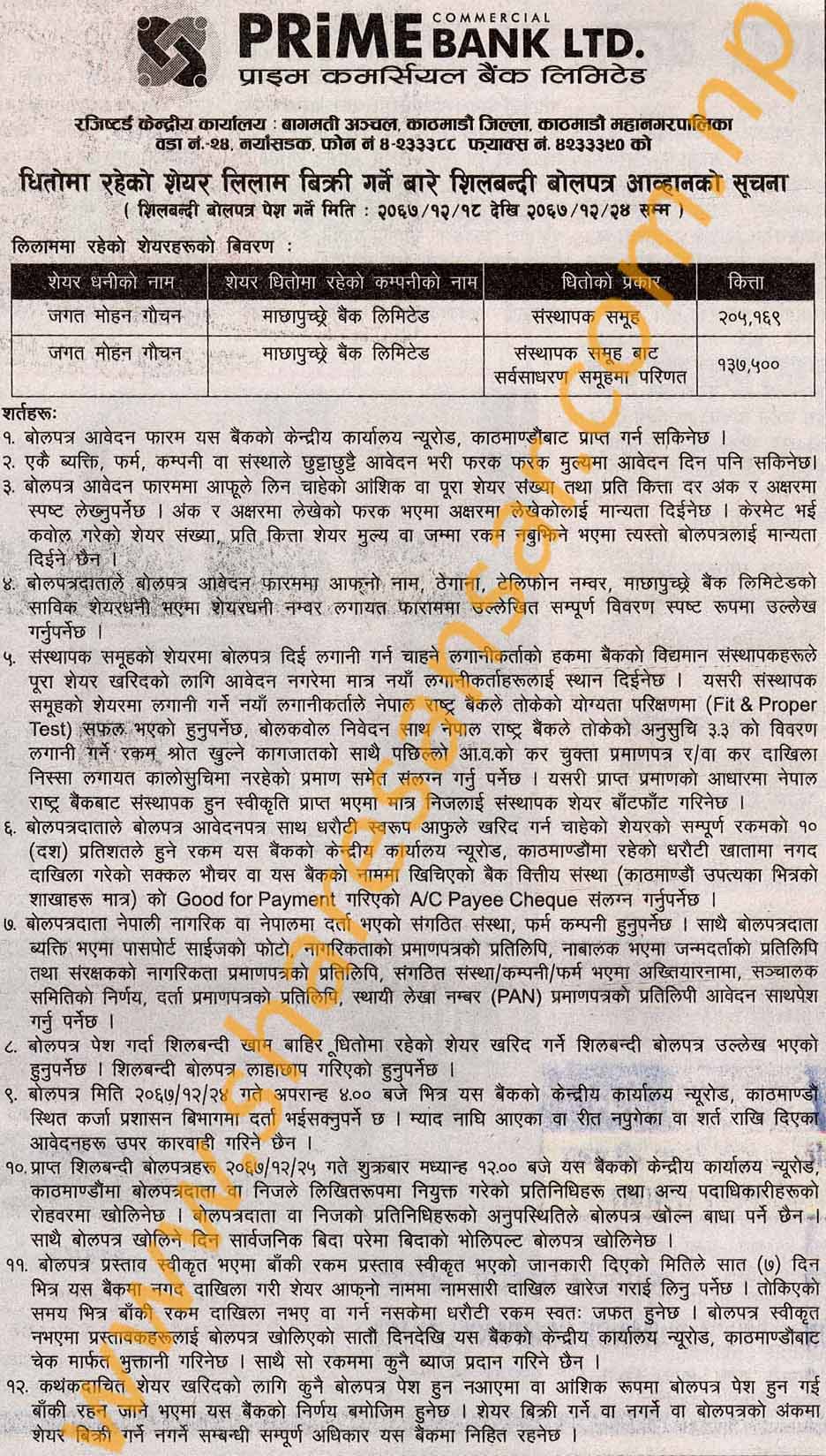 Prime Commercial Bank has announced a notice regarding auction shares of 342,669 kitta collateral shares of Machhachapuchhre Bank which were in the name of Jagat Mohan Gaucchan.
