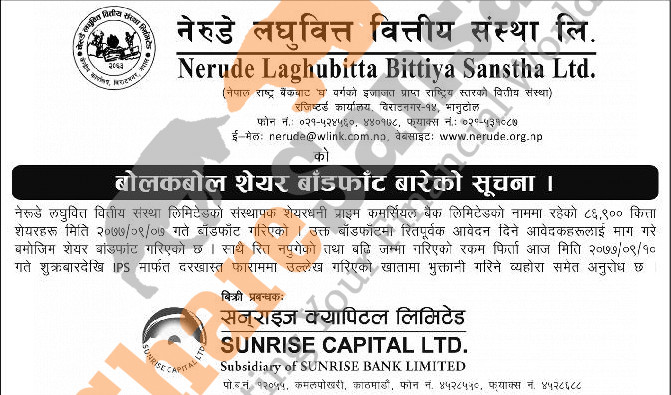 Prime Commercial Bank Limited has alloted 34,150 units promoter shares of (Nerude Laghubitta Bittiya Sanstha Limited) in auction to the general public on 7th Poush, 2077.