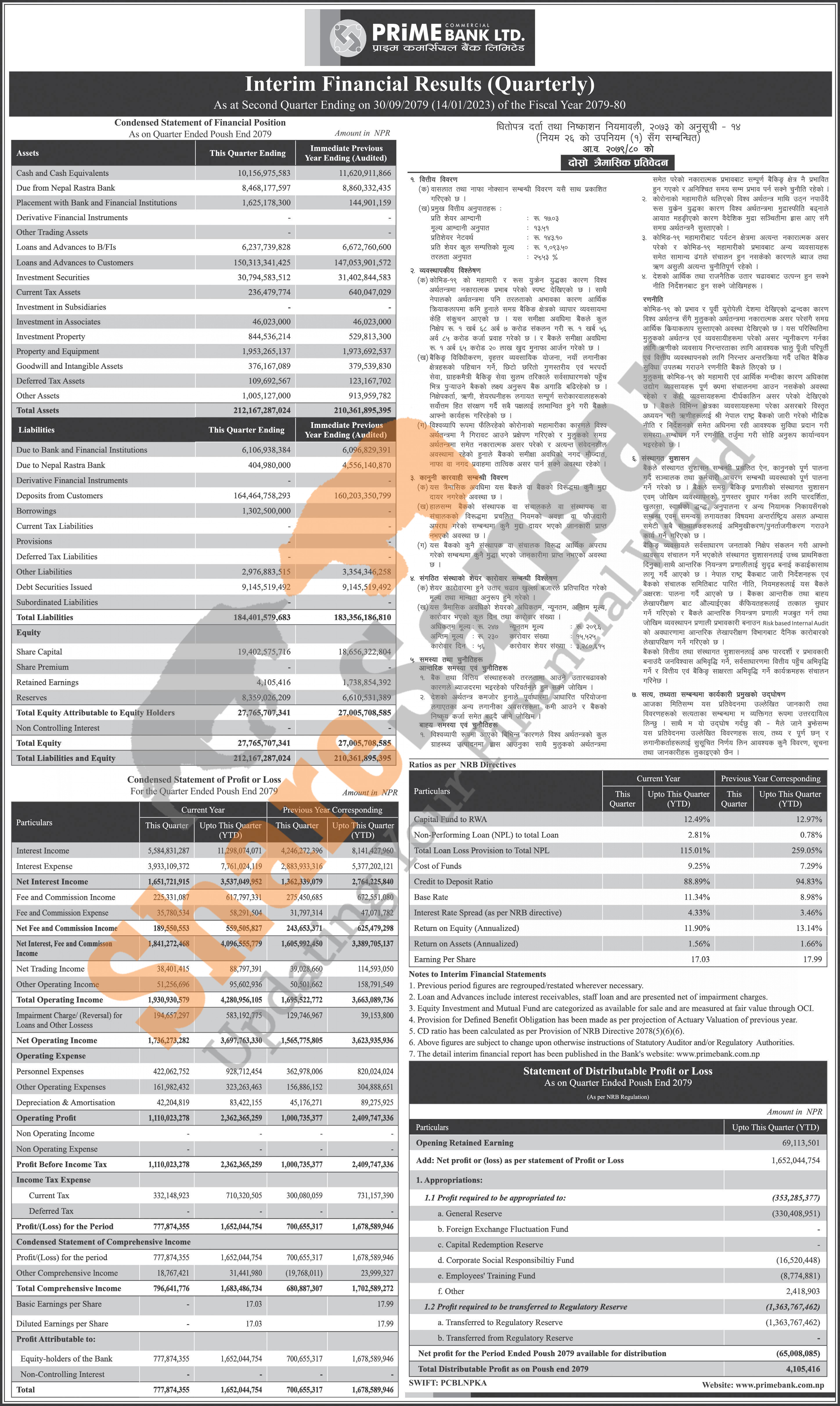 Prime Commercial Bank Limited has posted a net profit of Rs 1.65 billion and published its 2nd quarter company analysis of the fiscal year 2079/80.