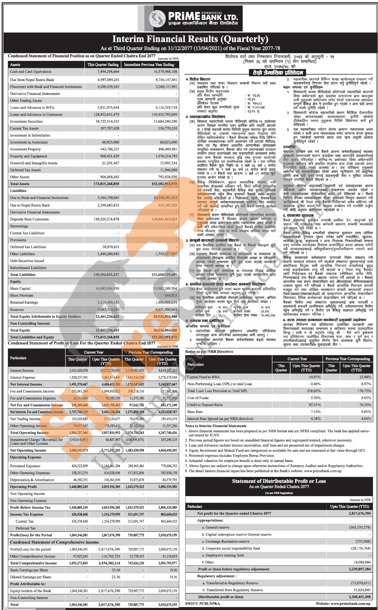 Prime Commercial Bank Limited has posted a net profit of Rs 2.81 billion and published its 3rd quarter company analysis of the fiscal year 2077/78.