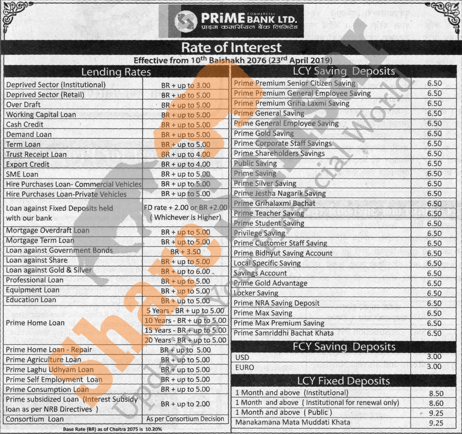 Prime Commercial Bank Limited has published a notice regarding new interest rate and its effective from 10th Baishakh, 2076.