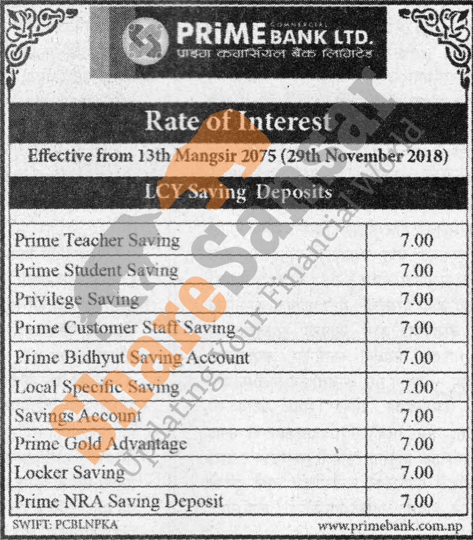Prime Commercial Bank Limited has published a notice regarding new interest rate and its effective from 13th Mangsir, 2075.