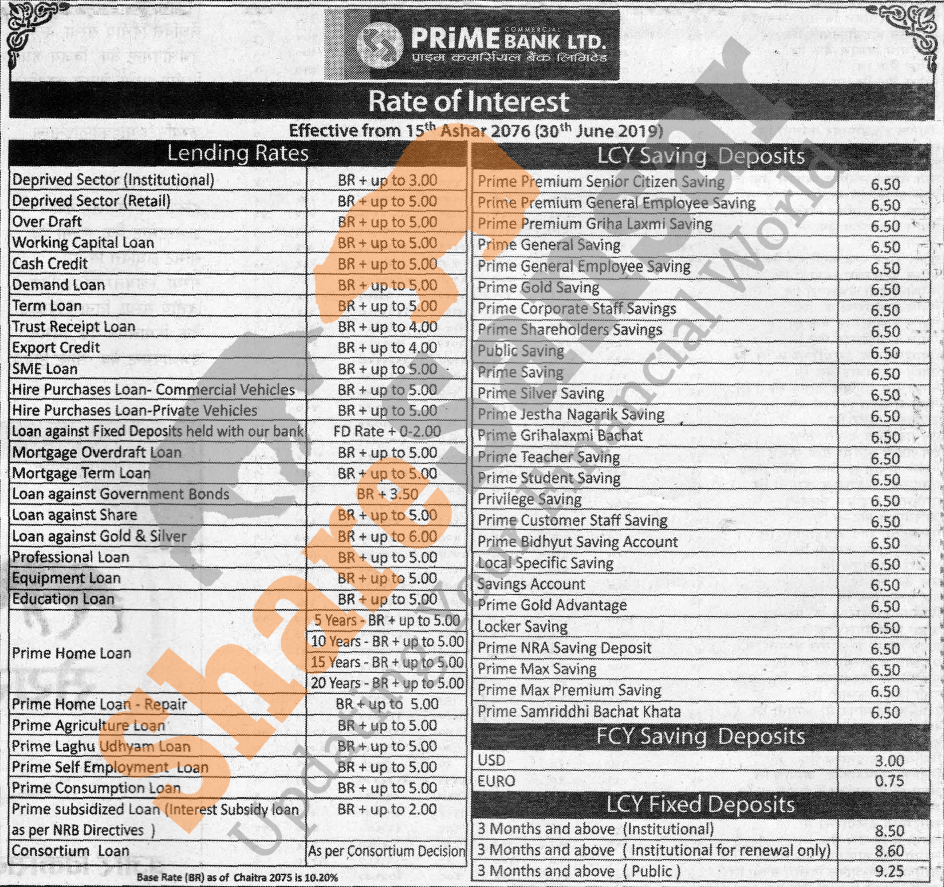 Prime Commercial Bank Limited has published a notice regarding new interest rate and its effective from 15th Ashad, 2076.