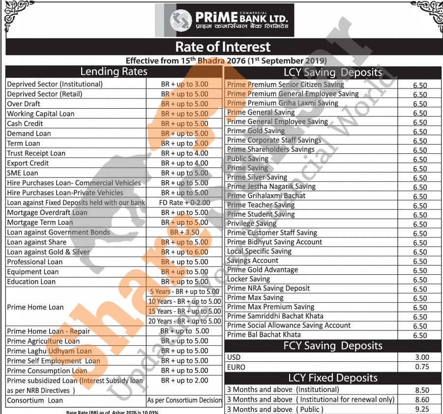 Prime Commercial Bank Limited has published a notice regarding new interest rate and its effective from 15th Bhadra, 2076.