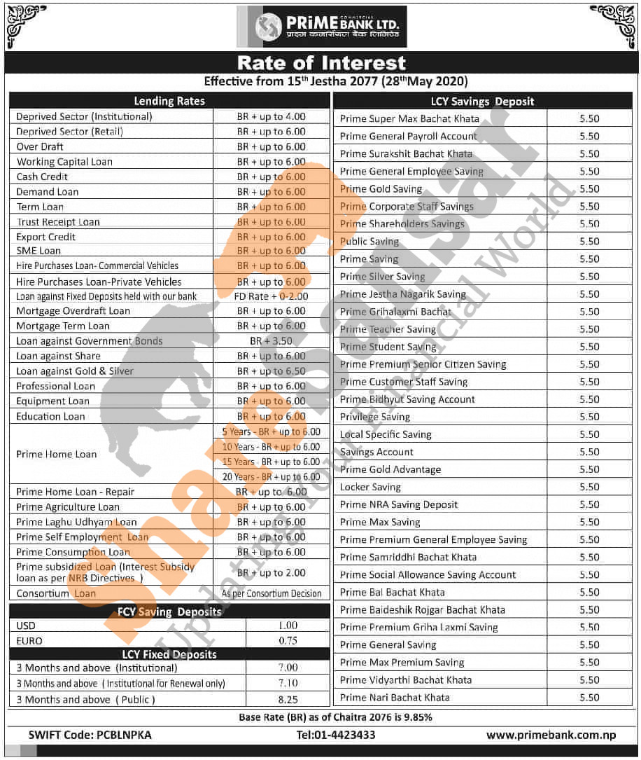 Prime Commercial Bank Limited has published a notice regarding new interest rate and its effective from 15th Jestha, 2077.
