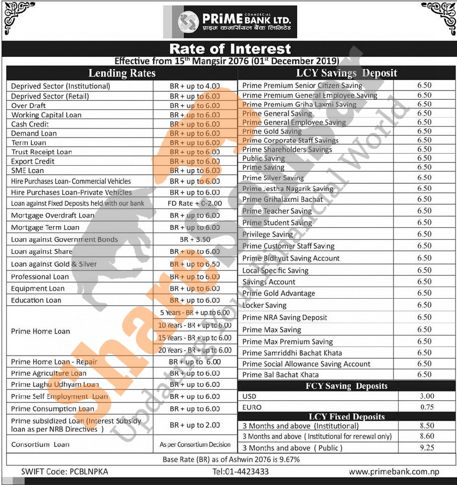 Prime Commercial Bank Limited has published a notice regarding new interest rate and its effective from 15th Mangsir, 2076.