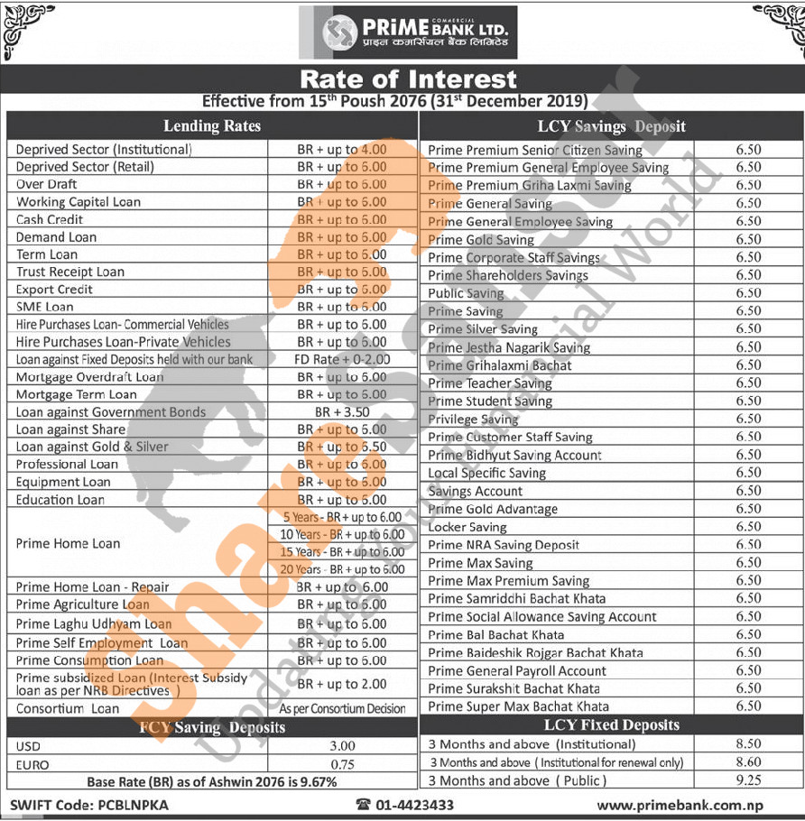 Prime Commercial Bank Limited has published a notice regarding new interest rate and its effective from 15th Poush, 2076.