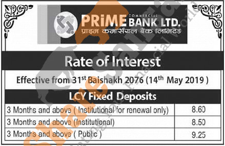 Prime Commercial Bank Limited has published a notice regarding new interest rate and its effective from 31st Baishakh, 2076.