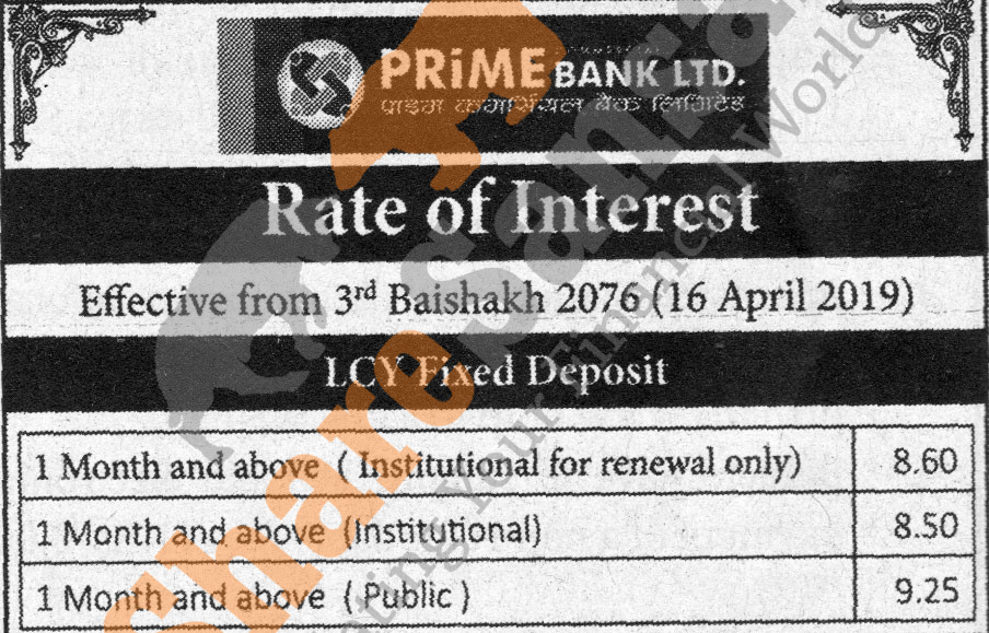 Prime Commercial Bank Limited has published a notice regarding new interest rate and its effective from 3rd Baishakh, 2076.