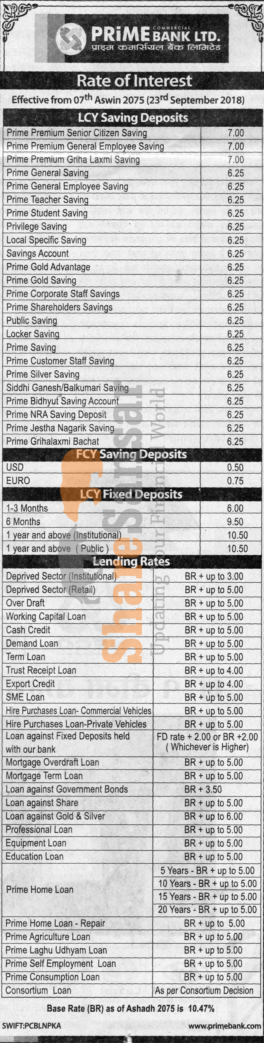 Prime Commercial Bank Limited has published a notice regarding new interest rate and its effective from 7th ashwin, 2075.