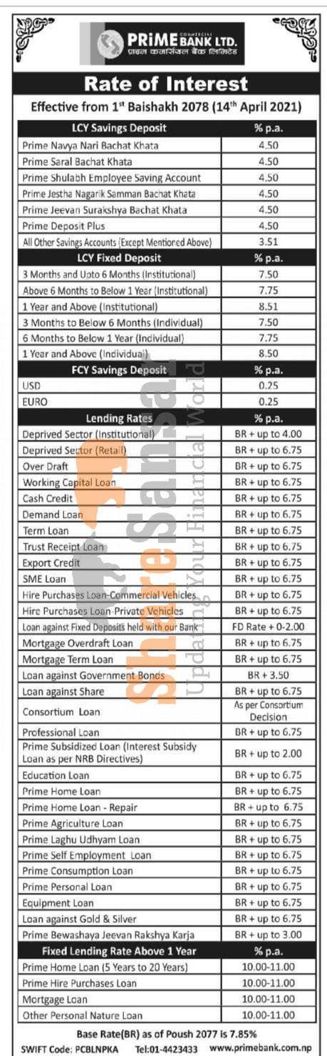 Prime Commercial Bank Limited has published a notice regarding the new interest rate for deposit and loan products and it's effective from 1st Baisakh, 2078.