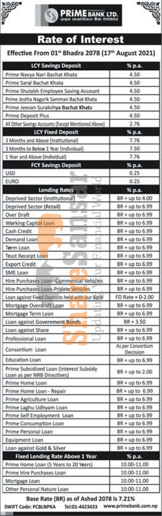Prime Commercial Bank Limited has published a notice regarding the new interest rate for deposit and loan products and it's effective from 1st Bhadra, 2078.