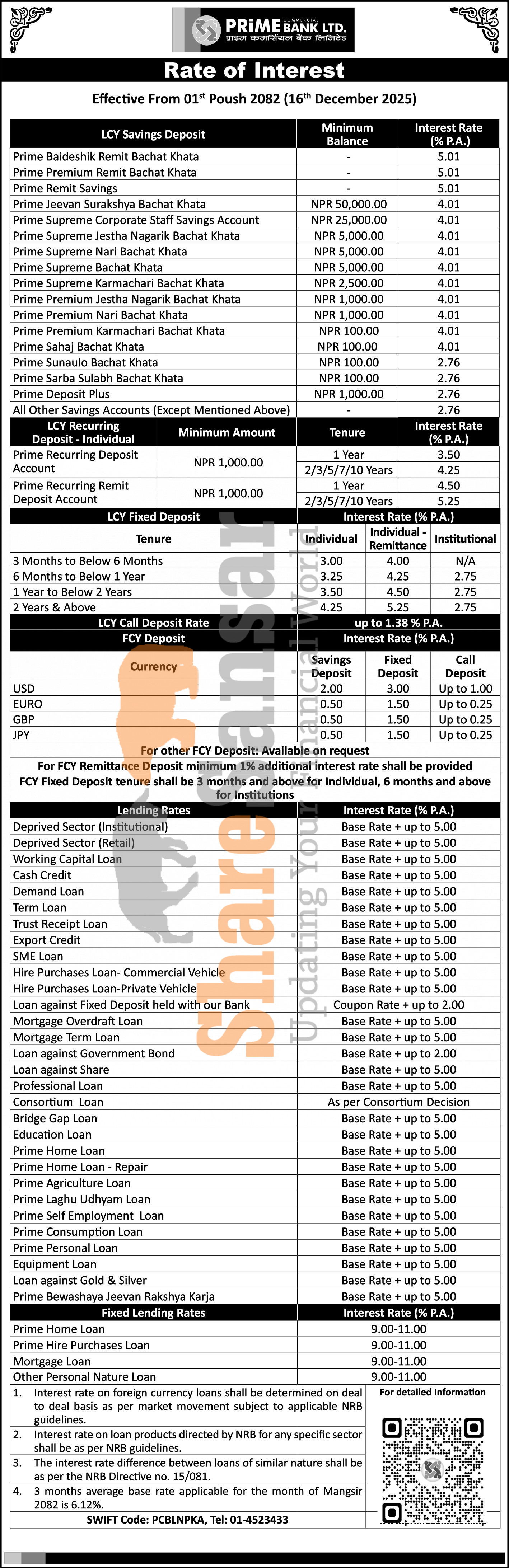 Prime Commercial Bank Limited has published a notice regarding the new interest rate for deposit and loan products and it's effective from 1st Poush, 2082.