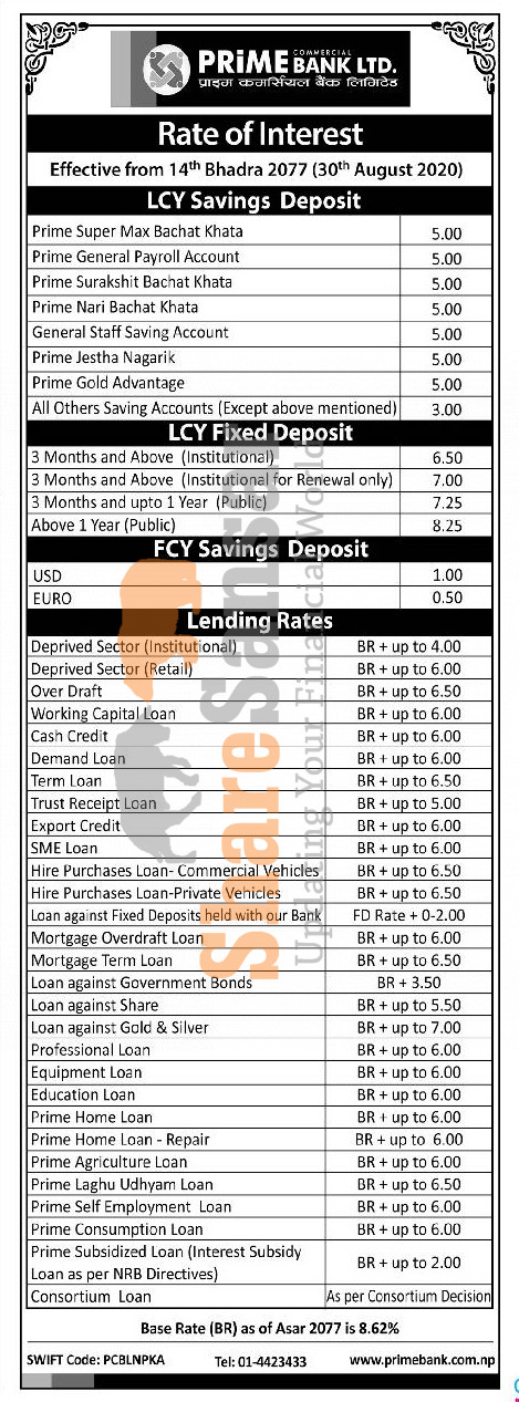 Prime Commercial Bank Limited has published a notice regarding the new interest rate for its deposit and loan products and its effective from 14th Bhadra, 2077.
