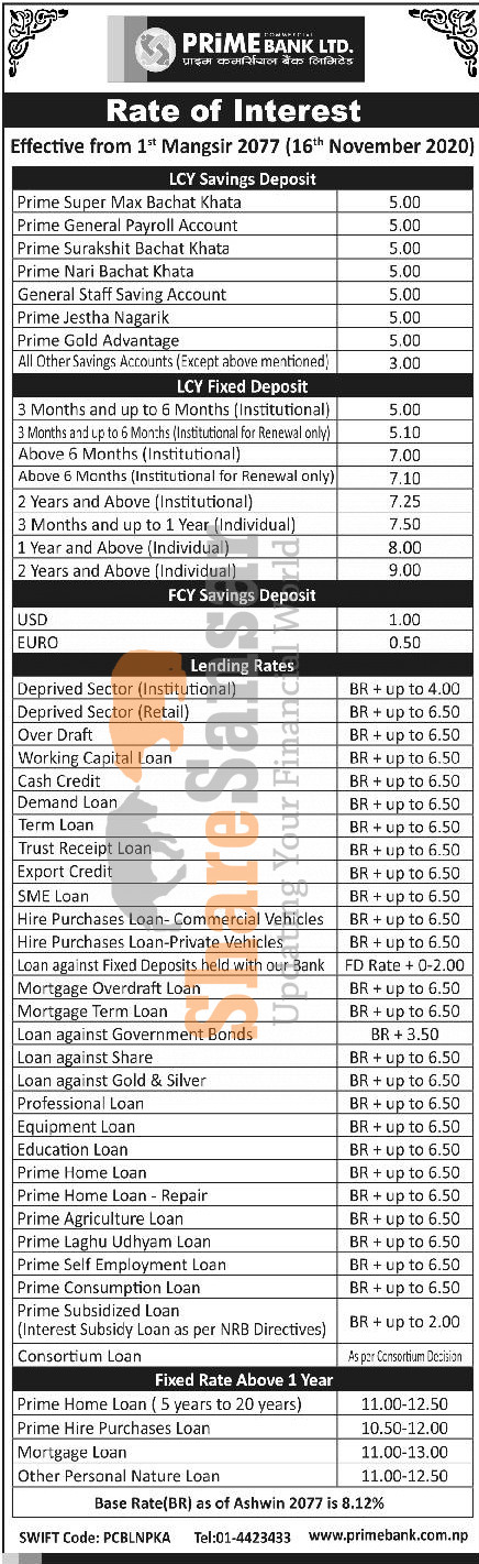 Prime Commercial Bank Limited has published a notice regarding the new interest rate for its deposit products and it's effective from 1st Mangsir, 2077.