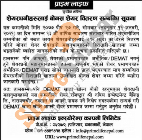 Prime Life Insurance Company Limited has distributed 7% bonus shares directly to DEMAT accounts of its shareholders and has urged to dematerialize their shares.