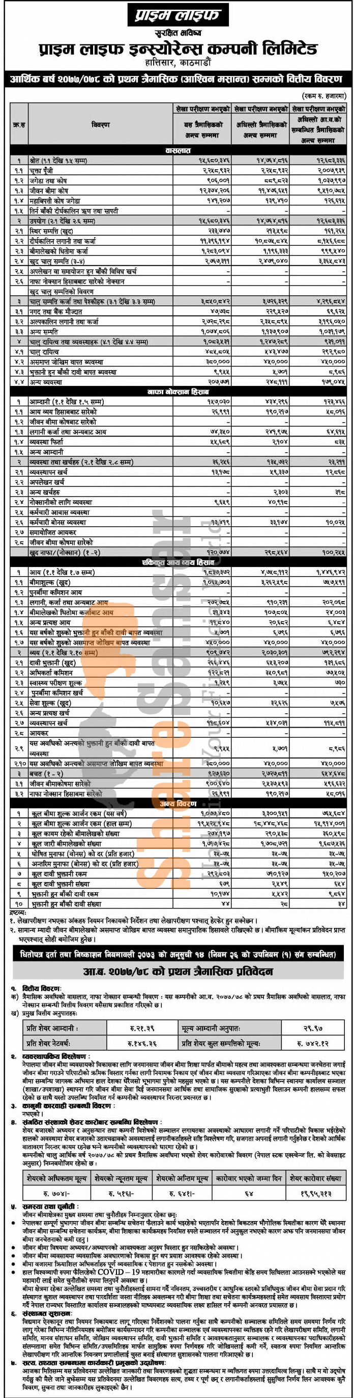 Prime Life Insurance Company Limited has posted a net profit of Rs 120.77 million and published its 1st quarter company analysis of the fiscal year 2077/78.