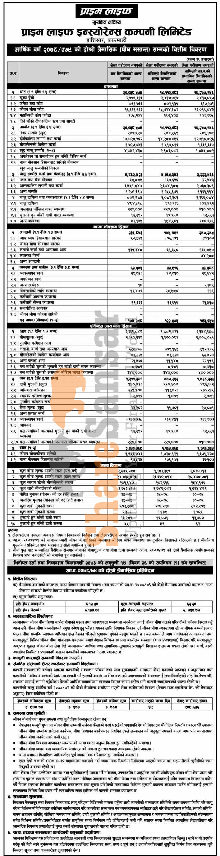 Prime Life Insurance Company Limited has posted a net profit of Rs 174.29 million and published its 2nd quarter company analysis of the fiscal year 2078/79.