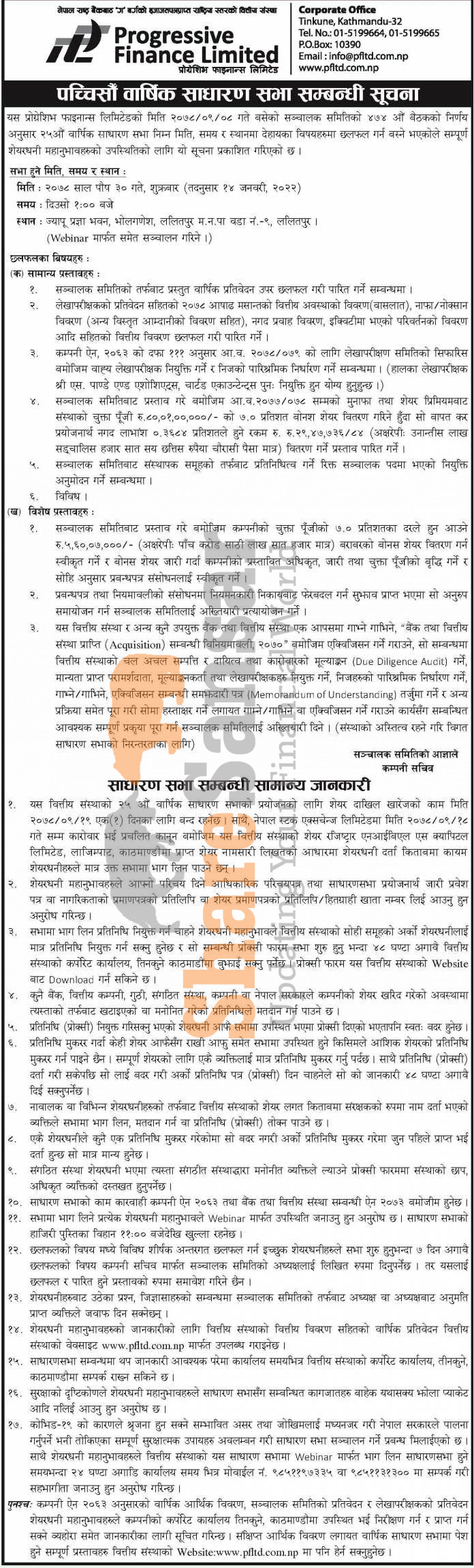 Progressive Finance Company Limited has announced its 25th AGM going to be held on 30th Poush, 2078.