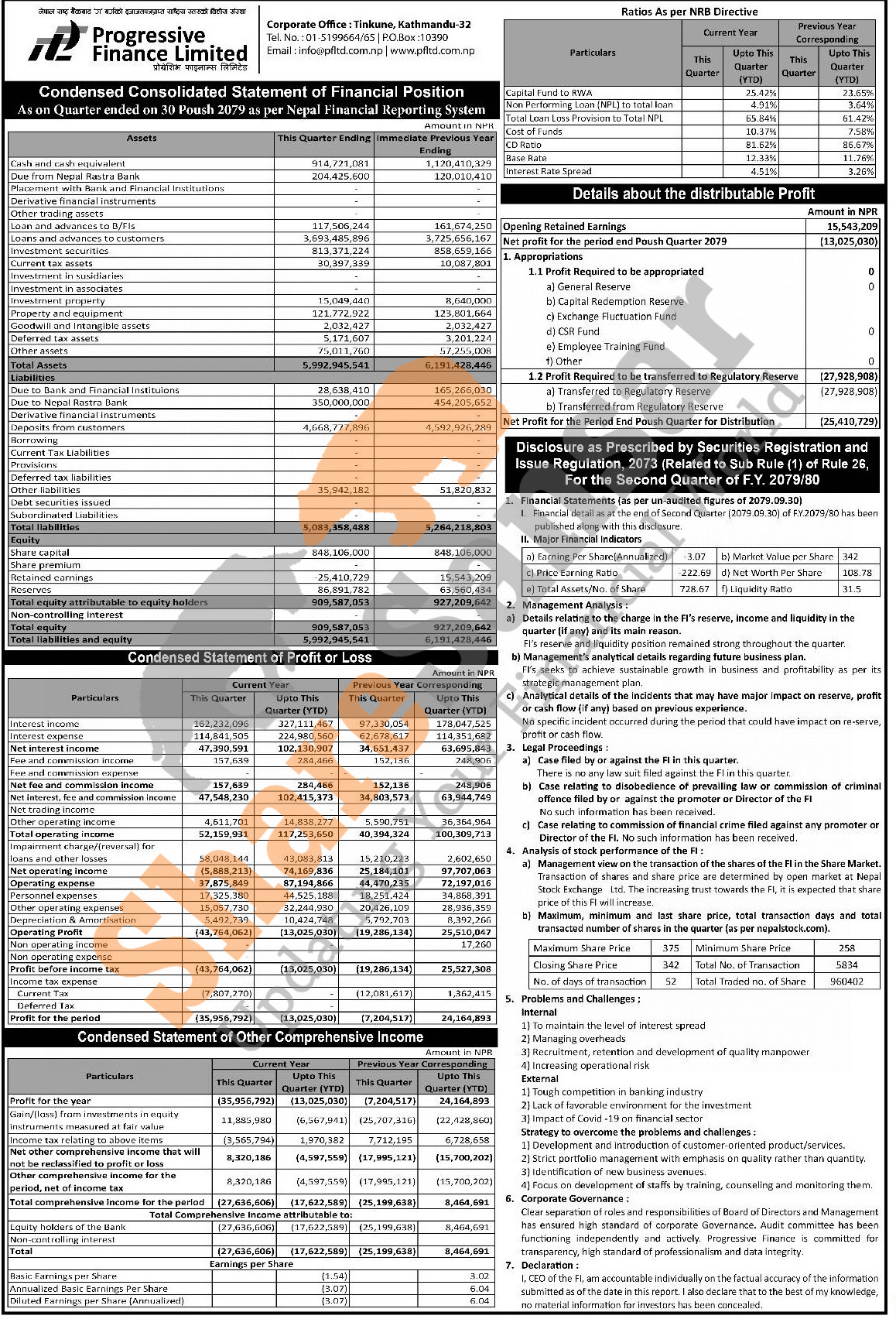 Progressive Finance Limited has posted a net loss of Rs 13.02 million and published its 2nd quarter company analysis of the fiscal year 2079/80.