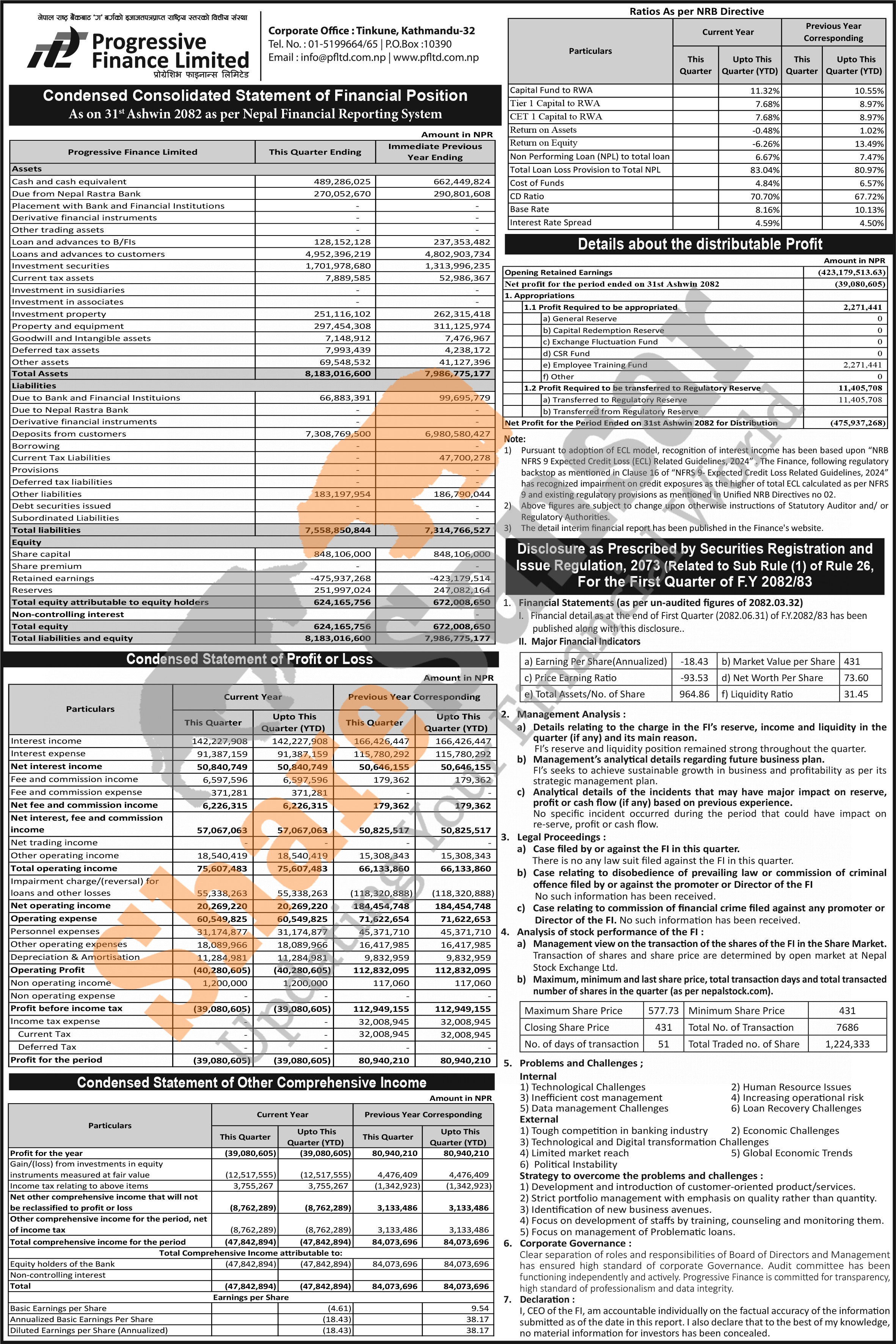 Progressive Finance Limited has posted a net loss of Rs 39.08 million and published its 1st quarter company analysis of the fiscal year 2082/83.