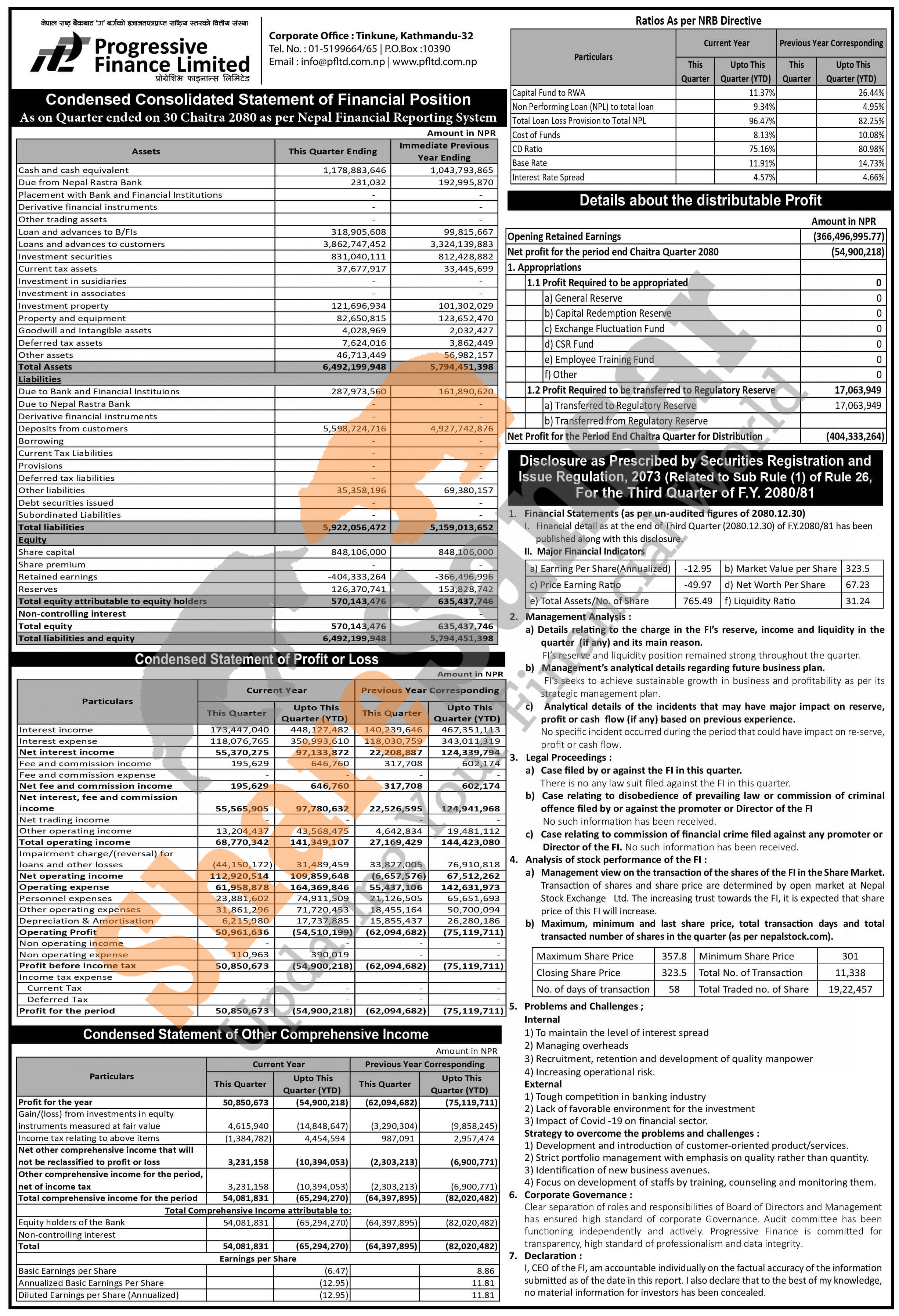Progressive Finance Limited has posted a net loss of Rs 54.90 million and published its 3rd quarter company analysis of the fiscal year 2080/81.
