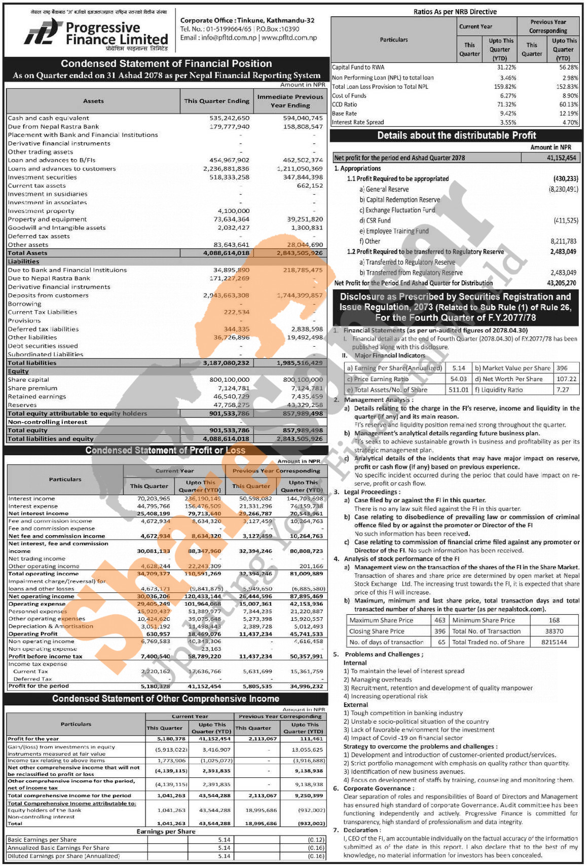 Progressive Finance Limited has posted a net profit of Rs 41.15 million and published its 4th quarter company analysis of the fiscal year 2077/78.