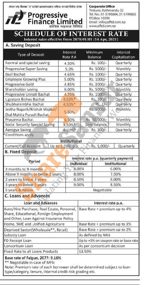 Progressive Finance Limited has published a notice regarding the new interest rate for deposit and loan products and it's effective from 1st Baisakh, 2078.