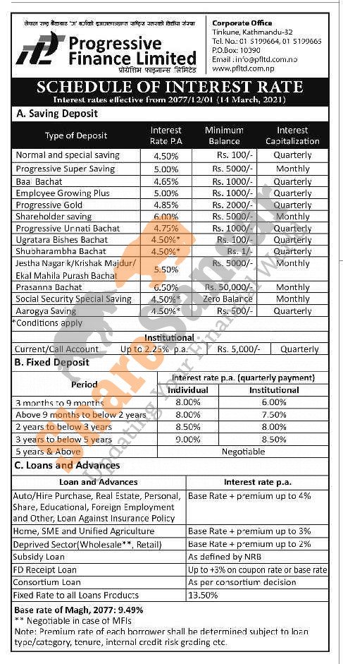 Progressive Finance Limited has published a notice regarding the new interest rate for deposit and loan products and it's effective from 1st Chaitra, 2077.