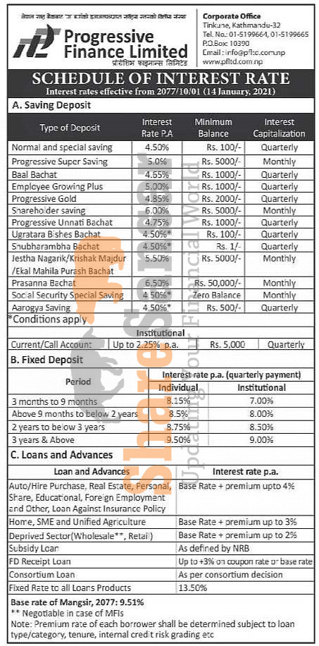 Progressive Finance Limited has published a notice regarding the new interest rate for deposit and loan products and it's effective from 1st Magh, 2077.