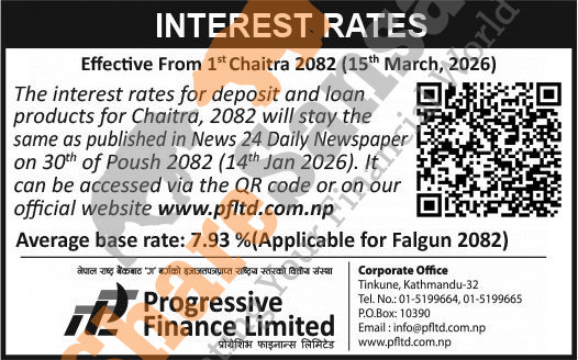 Progressive Finance Limited has published a notice regarding the new interest rate for deposit but loan products will remain the same as of the previous month and it's effective from 1st Chaitra, 2082.