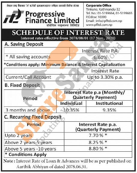 Progressive Finance Limited has published a notice regarding the new interest rate for its deposit products and it's effective from 1st Mangshir, 2078.