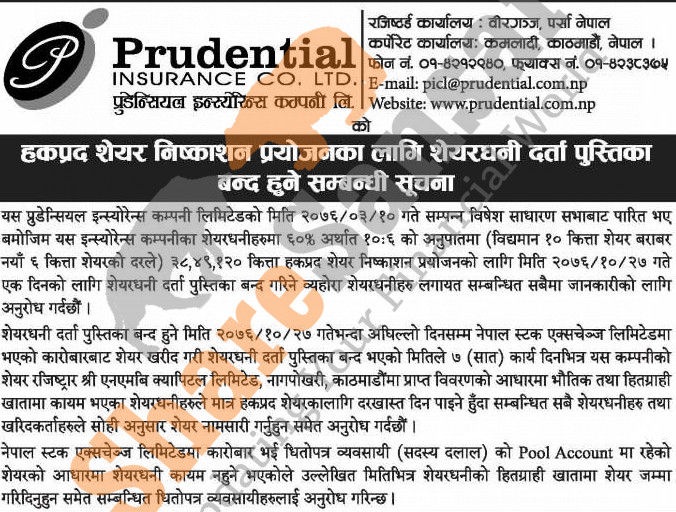 Prudential Insurance Company Limited has announced a book closure date for its upcoming 10:6 ratio right share on 27th Magh, 2076.