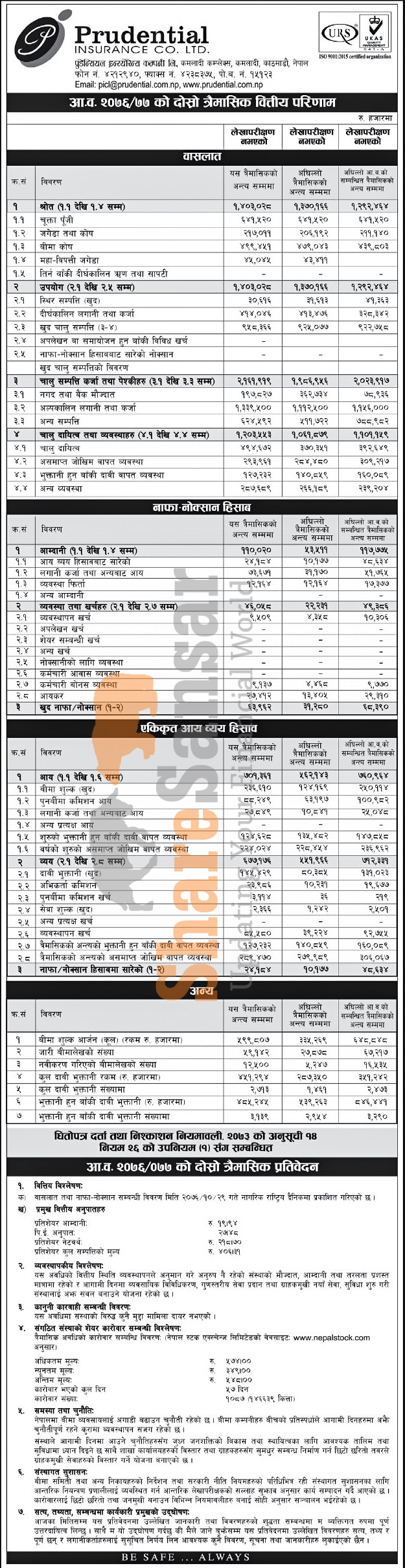 Prudential Insurance Company Limited has posted a net profit of Rs 63.93 million and published its 2nd quarter company analysis of the fiscal year 2076/77.