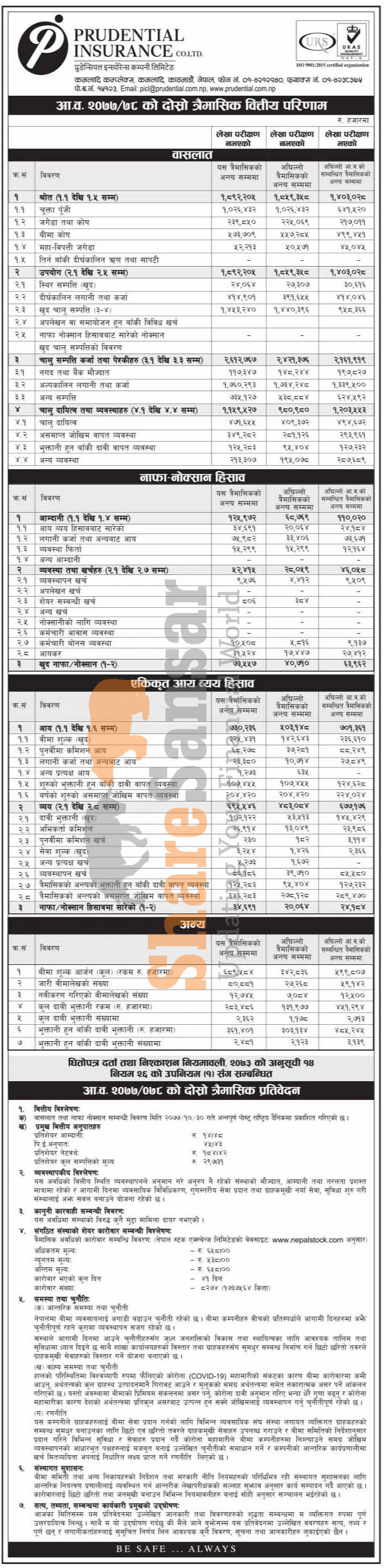 Prudential Insurance Company Limited has posted a net profit of Rs 73.55 million and published its 2nd quarter company analysis of the fiscal year 2077/78.